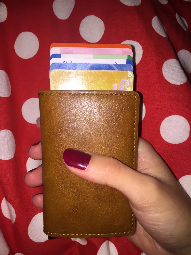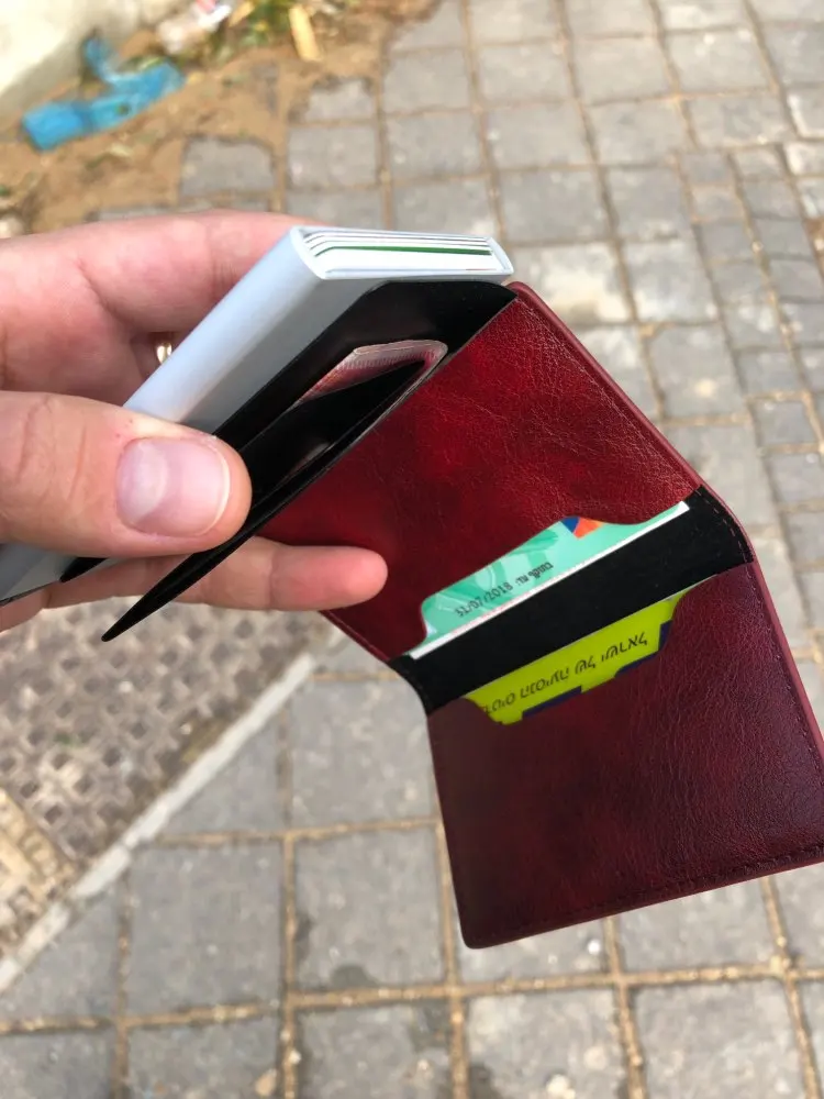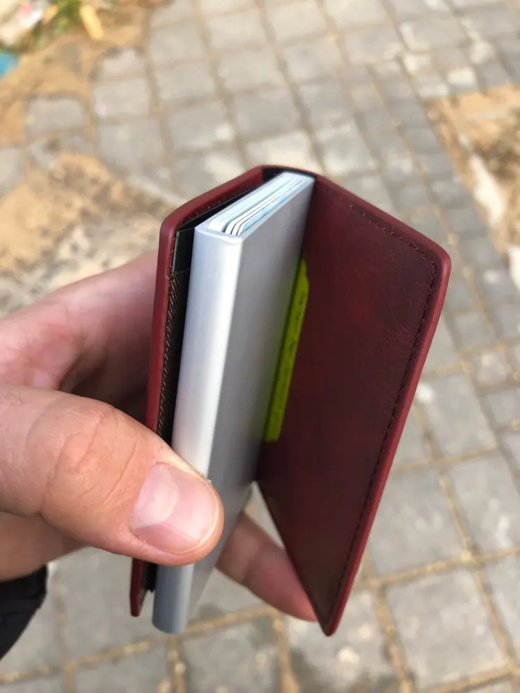 High-quality card holder with note compartment and 2 extra cardholder areas in the wallet. The cardholder unit uses a pull out tab to eject you cards for easy access. The cardholder unit holds 6 flat cards or 3 Embossed cards. It also is RFID protected.
